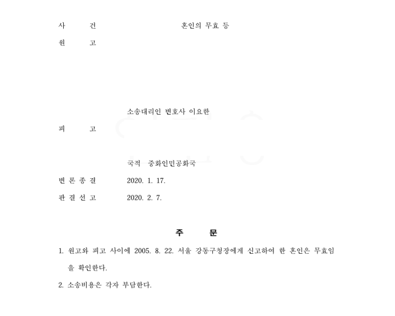 오늘은 제가 한국인 남성과 위장결혼한 중국인 여성을 상대로 혼인무효 소송을 제기하여, 혼인무효 판결을 받은 사례를 소개해드리겠습니다.