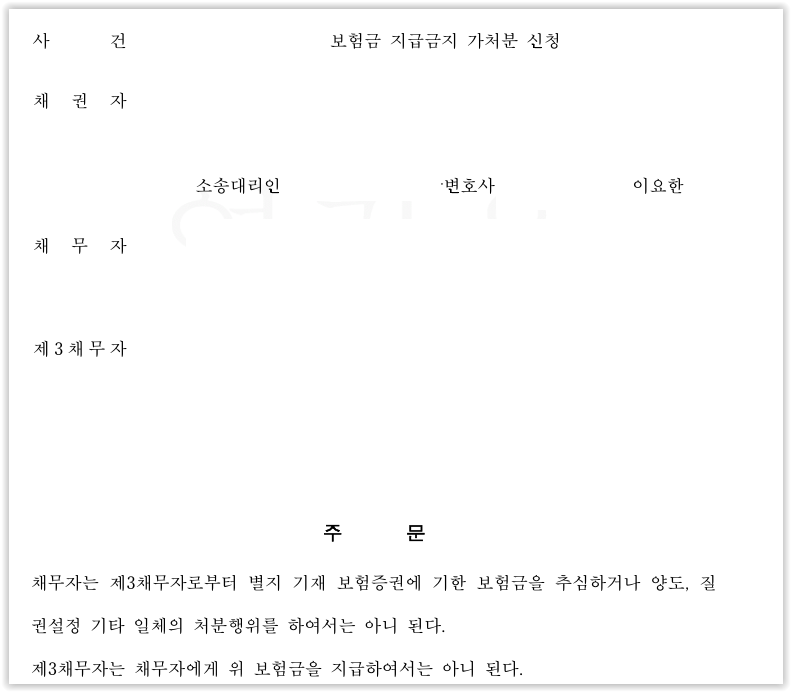 박정용이 돈을 받아가기 전 신속한 대처가 필요하였고, 회사와 보험사 담당자에 퇴직금 및 보험금을 지급하지 말라는 통지를 하였습니다. 동시에 회사를 상대로 채권추심 및 처분금지 가처분 신청, 보험사를 상대로 보험금 지급금지 가처분 신청을 하였습니다.