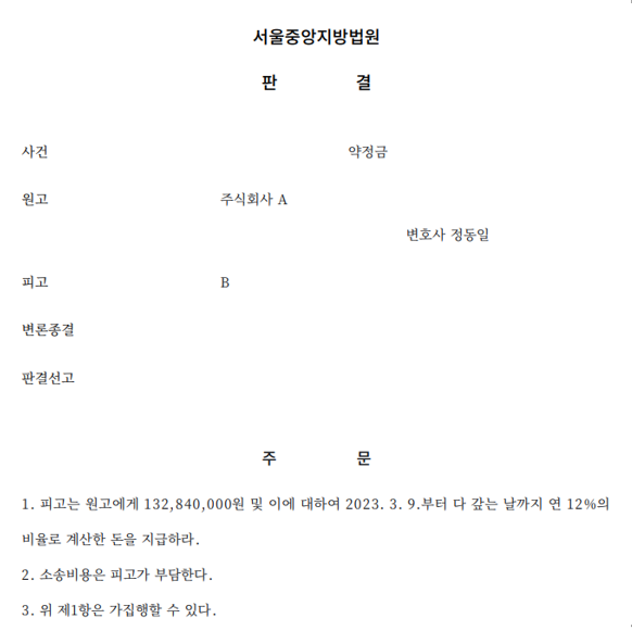 재판부 역시 변론 초반 의뢰인에게 약정금 달성이 되었다는 사실을 소명하라고 압박하였으나, 정동일 변호사가 계약서의 취지 및 내용, 각종 자료를 제시하며 상세히 약정금 지급 근거를 설명하자 전부 승소 판결을 내렸습니다.