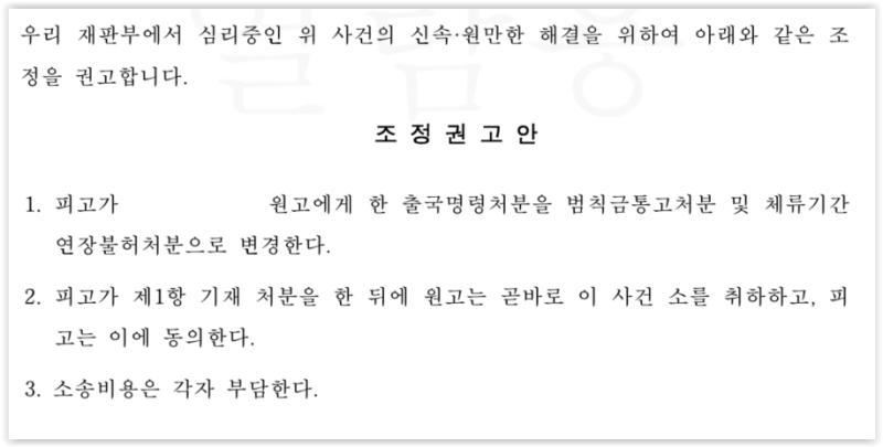 조정권고에 대해 피고는 동의하고 있었습니다. 의뢰인만 동의한다면 의뢰인은 강제출국·입국규제와 같은 불이익을 당할 필요 없이 한국에서 계속 거주할 수 있었습니다.