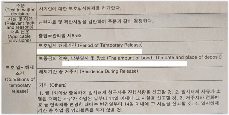보호외국인의 범죄행위가 보호일시해제를 할 수 없는 사유에 해당하지 않는다면, 신원보증인의 보증과 2,000만원의 보증금 예치 조건으로 보호일시해제결정을 받을 수 있습니다.