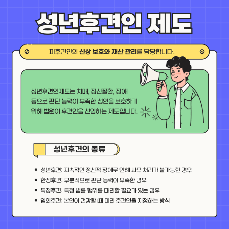 법정후견은 피후견인의 상태에 따라 크게 세 가지로 구분됩니다.