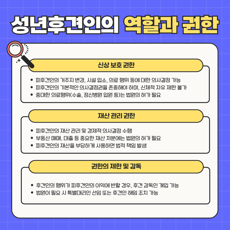 피후견인의 거주지 변경, 시설 입소, 의료 행위 등에 대한 의사결정 권한을 가질 수 있습니다.