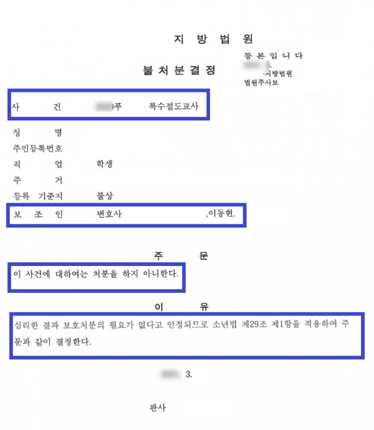 결국 이러한 주장을 받아들여, 가정법원은 A군에게 "혐의가 없다"며 "불처분"(무죄) 결정을 내렸습니다.