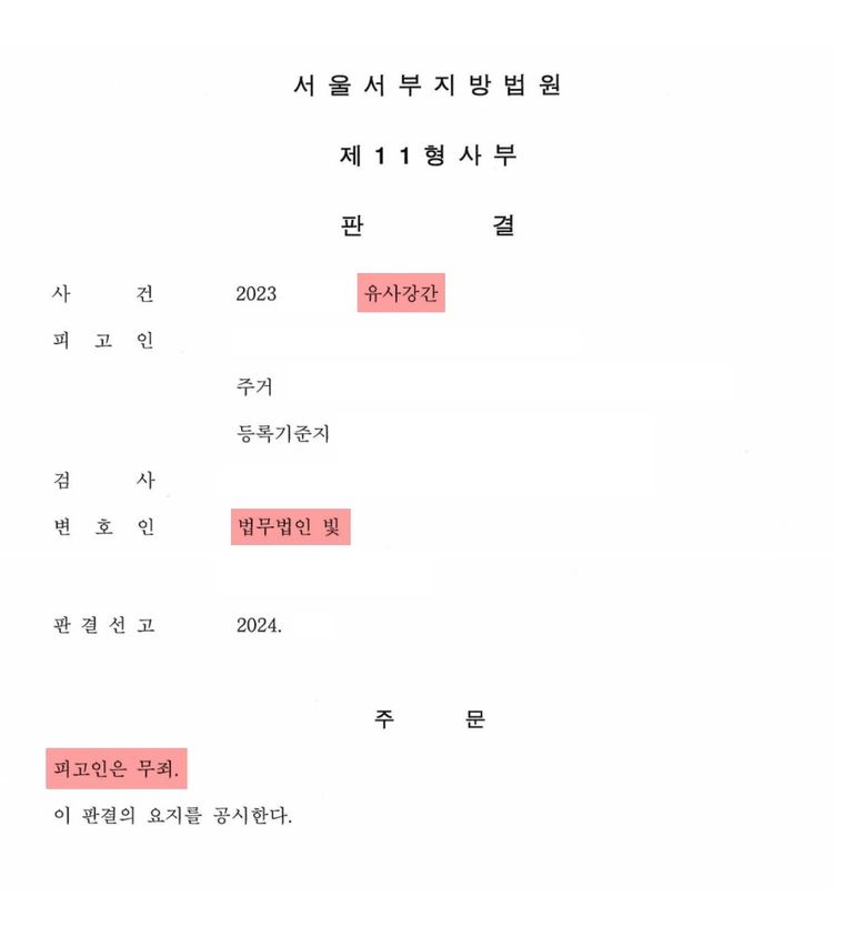 그러나 법무법인 빛에서는 의뢰인을 구하기 위해 최선을 다해, 유사강간 혐의, '무죄' 라는 결과로 의뢰인의 억울함을 풀어드렸습니다.