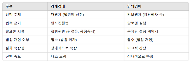 강제경매는 법원이 개입하여 절차가 진행되므로, 임의경매(채권자가 직접 담보권을 실행하는 경우)와는 차이가 있습니다.