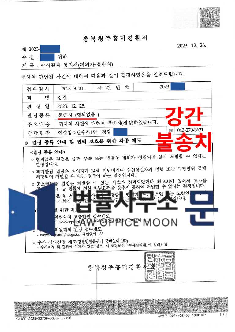 이후 법률사무소 문은 의뢰인의 피의자 조사에 동석하여, 해당 여성이 '폭행 또는 협박'으로 자신을 '강간'한 피의자에게 계속하여 '사랑한다', '사귀고 싶다'는 등의 발언을 한 사실을 밝히는 등 의뢰인이 해당 여성을 강간하였다고 보기 어려운 사정을 주장하였습니다.