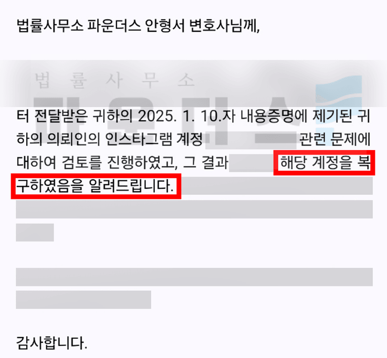 결과적으로 의뢰인 홀로 인스타 측에 수십 여 차례 복구 요청을 했을 시 회신을 받지 못한 상황과는 달리 법률대리인의 내용증명 발송 이후 계정 복구가 이루어졌고 의뢰인은 계정 활동을 이어갈 수 있게 되었습니다.
