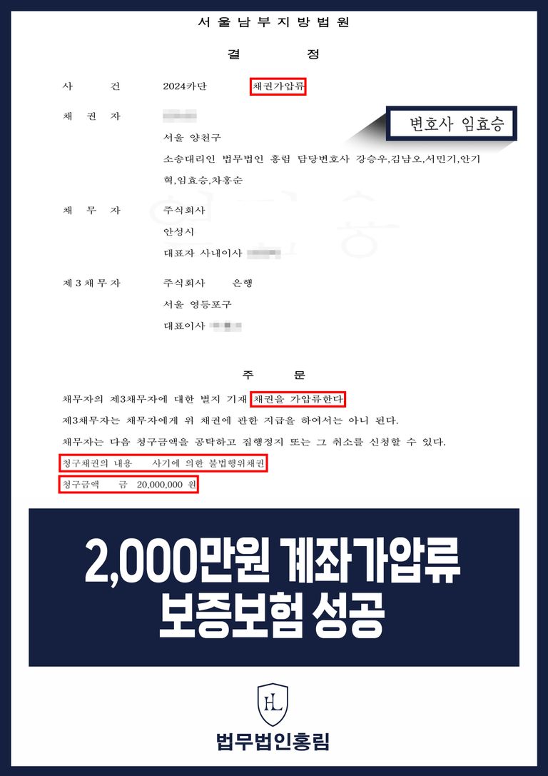 그 결과 법원에서는 본 변호인의 주장을 받아들여 통장 가압류(전액 보증보험)하였습니다.