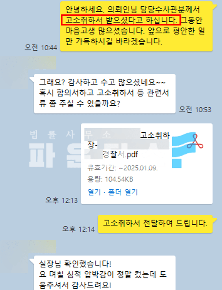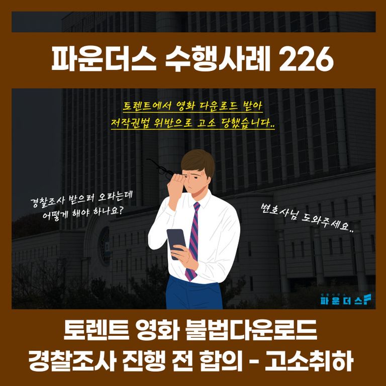 그 결과 의뢰인은 토렌트 저작권법 위반 사건에서 원만한 협상 진행 및 합의 작성을 하게 되었고 고소 취하 즉, 사건 종결로 경찰조사 진행 전 마무리 지을 수 있었습니다.