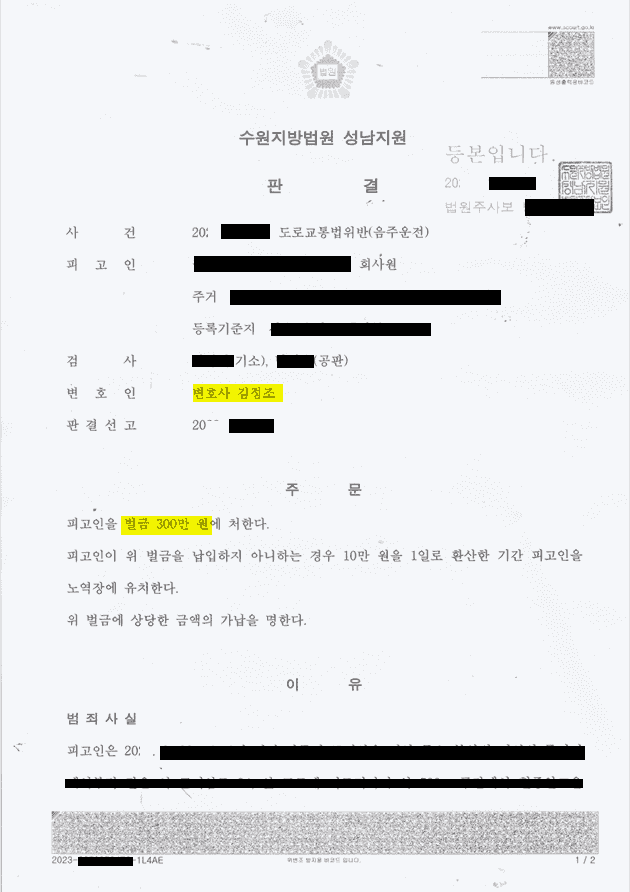 위와 같은 노력의 결과, 의뢰인 분은 걱정하시던 실형과 집행유예를 면하면서 가장 낮은 형인 벌금형으로 사건을 마무리할 수 있었습니다.