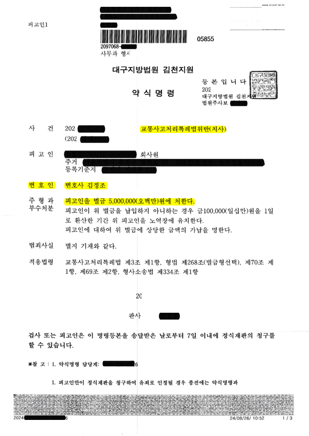 위와 같은 노력의 결과, 의뢰인 분은 구약식(벌금 500만 원)으로 사건이 마무리될 수 있었습니다.