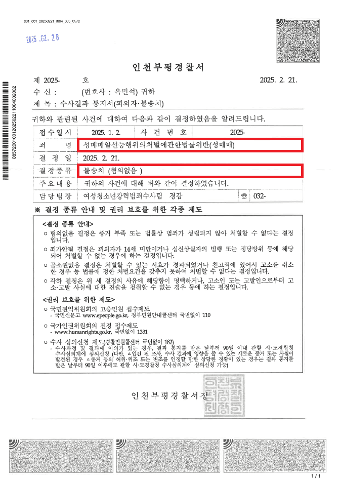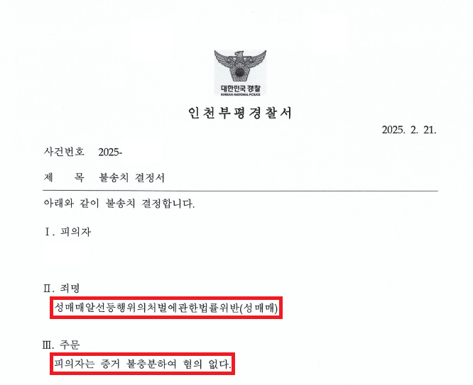 공무원 A씨는 인천부평경찰서로부터 "2023. 11. 21. 23:20경 성매매 여성 B씨와 성매매를 한 혐의로 조사를 받아야 한다."라는 연락을 받게 되었습니다.