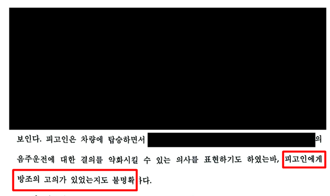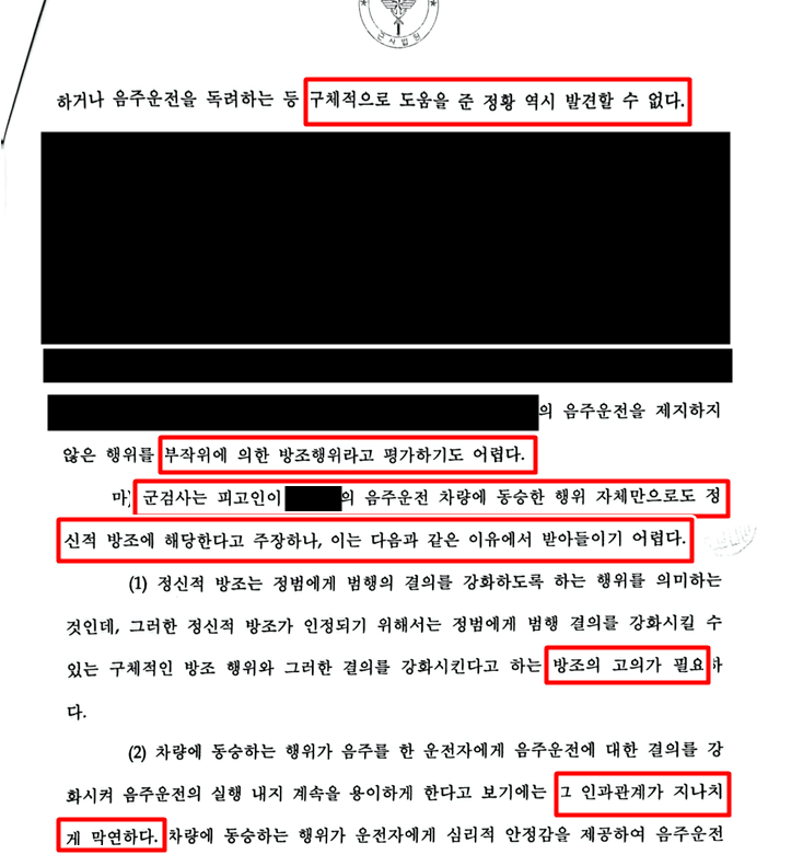 가장 핵심적인 부분은, 음주운전 행위를 물리적으로 용이하게 해준 사실이 없으며, 운전 결의를 강화하게 하는 정신적 지지를 해준 사실이 없고 방조의 고의 또한 없다는 점이었습니다.