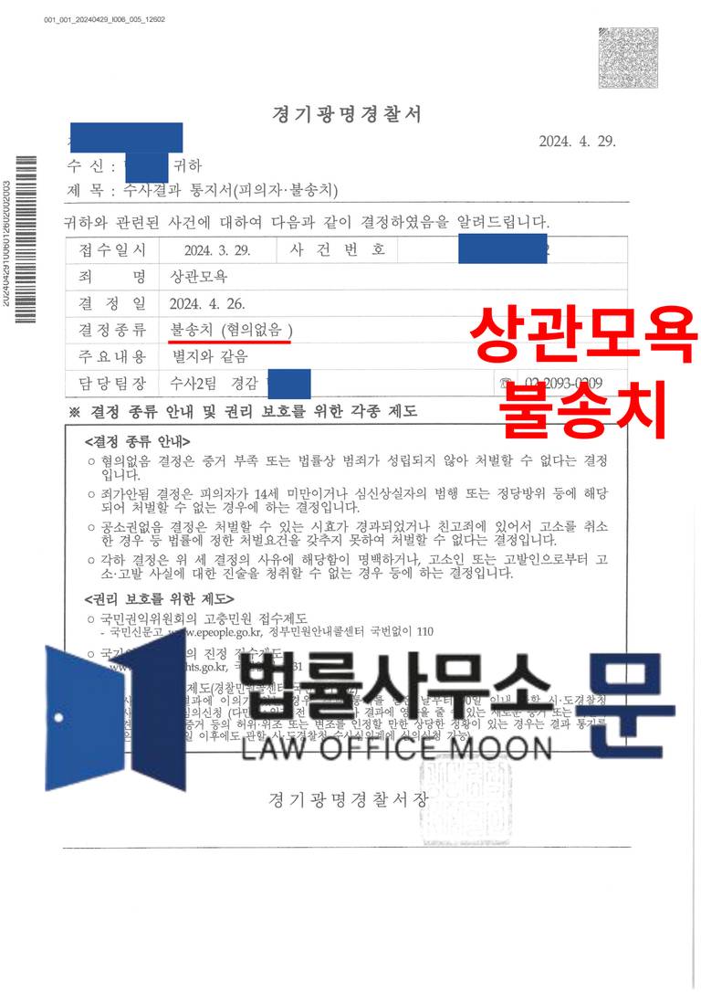 경찰은 법률사무소 문의 주장을 받아들여 의뢰인의 상관모욕 혐의에 대하여 불송치 처분을 하였습니다.