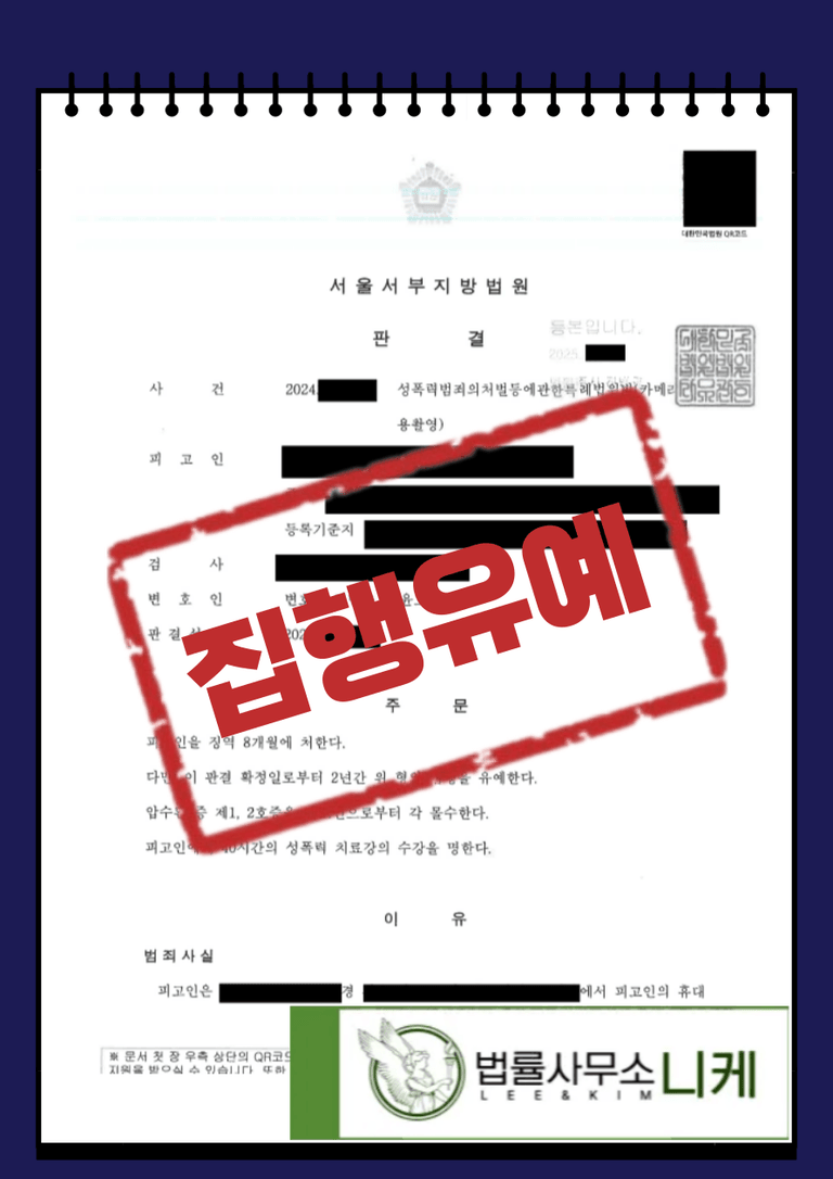 그 결과 의뢰인은 성폭력범죄의처벌등에관한특례법위반(카메라등이용촬영) 혐의를 받고 법정형으로 최소 벌금형 최대 7년의 징역형을 선고받을 수 있었음에도 불구하고 집행유예 처분을 받을 수 있었습니다.