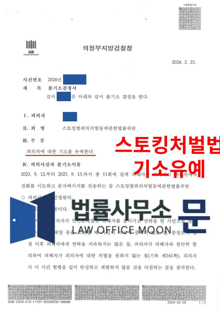 채팅 어플리케이션을 통해 알게 된 여성에 대한 스토킹 혐의로 입건된 의뢰인이 법률사무소 문의 조력을 받아 기소유예를 받은 사안