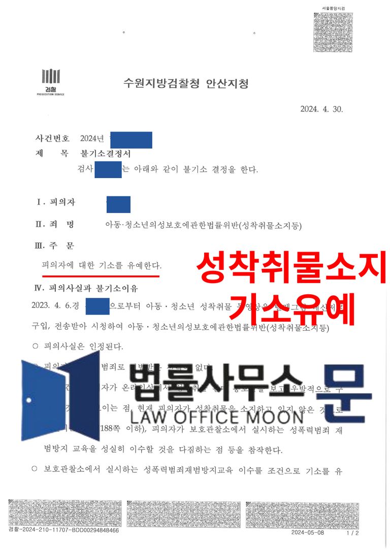 검찰은 의뢰인의 성착취물소지 혐의에 대하여 기소유예를 결정하였습니다.
