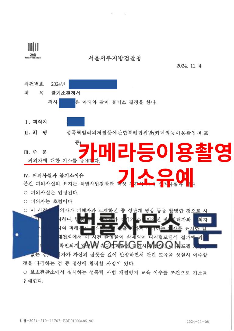수년전 고등학교 재학 당시 교제한 여자친구와 성관계하는 장면을 몰래 촬영하였던 혐의에 대하여 법률사무소 문의 조력을 받아 기소유예 받은 사안