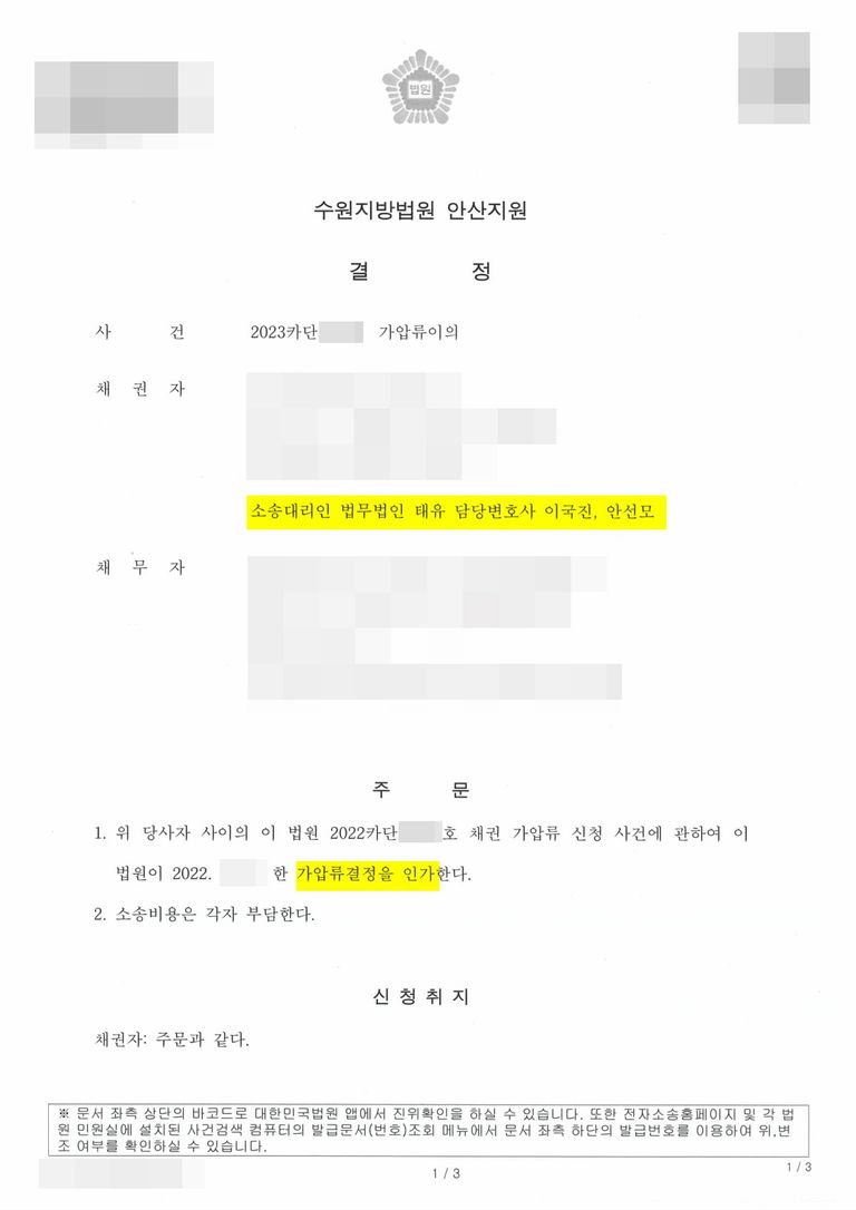 실제로 많은 채무자들이 가압류나 압류에 압박을 받기 때문에 가압류를 취소시킬 수 있는 가압류이의를 신청하기도 하는데요, 오늘 소개해드릴 사건은 가압류이의에 관한 것으로 의뢰인이신 법인에서 마찬가지로 상대방인 법인에 진행한 총 5건의 가압류와 이에 대한 상대방의 이의신청을 기각시킨 성공사례 입니다.