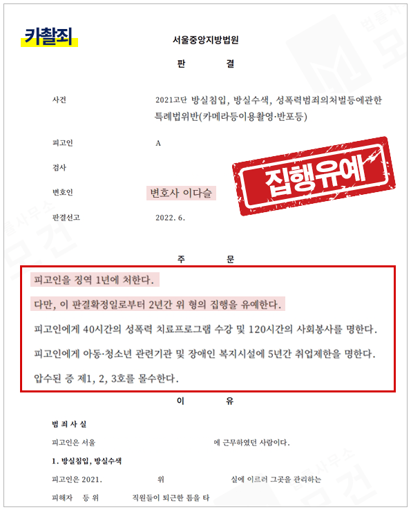 해당 사건은 카촬죄변호사인 이다슬 변호사가 피고인을 조력하였습니다.