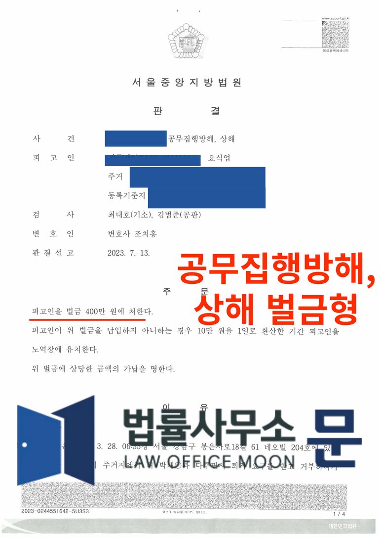 재판부는 법률사무소 문의 변호인의견서를 십분 참작하여 의뢰인에게 벌금형을 선고하였습니다.