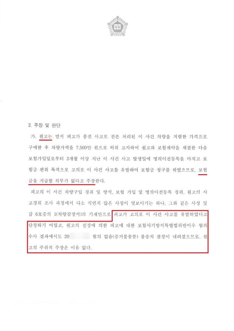 이에 A씨는 경찰과 보험사에 사건 사고를 접수하고 이후 보험금 지급을 청구했습니다. 그런데 보험사에서는 A씨가 이미 전손 처리된 차량을 저렴하게 구입한 후 운행이 가능할 정도로만 수리해 고의로 사고를 냈다며 보험금 지급을 거부하였습니다.