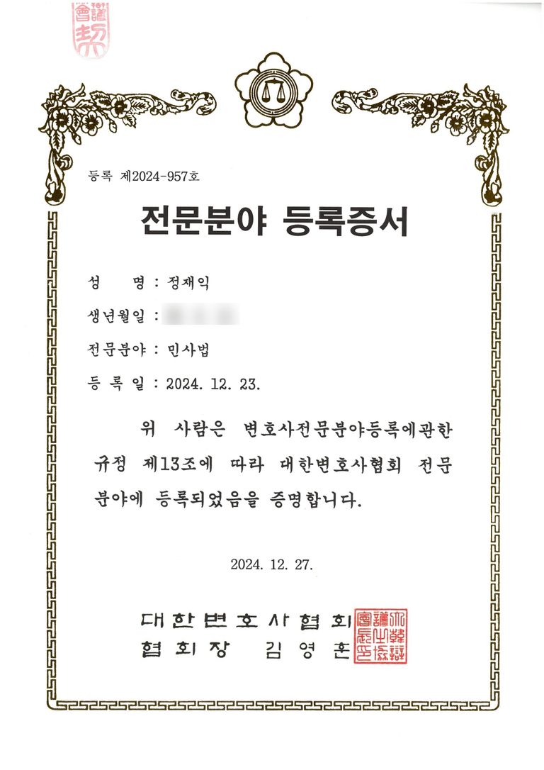 안녕하세요, 의뢰인의 마음까지 변호하는 대한변호사협회 등록 민사법 전문변호사 정재익 변호사입니다.