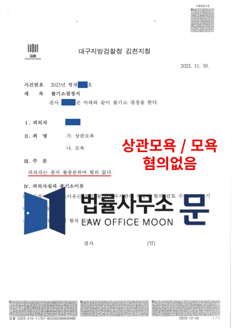 검사는 법률사무소 문의 변호인의견서를 토대로 의뢰인에게 혐의없음 결정을 하였습니다.