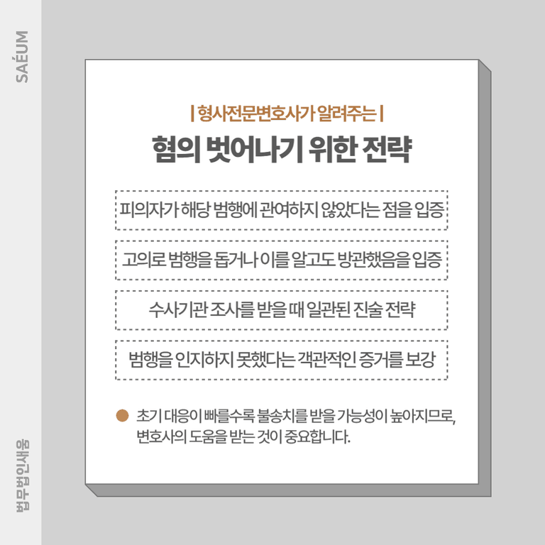 수사 과정에서 불리한 정황이 있다면, 이를 해명할 수 있는 자료를 확보하는 것도 필요합니다. 증인의 진술, 금융 거래 내역, 통신 기록 등을 통해 공모 또는 방조에 해당하지 않는다는 점을 적극적으로 소명하는 것이 무혐의 처분을 받는 핵심 전략이 될 수 있습니다.