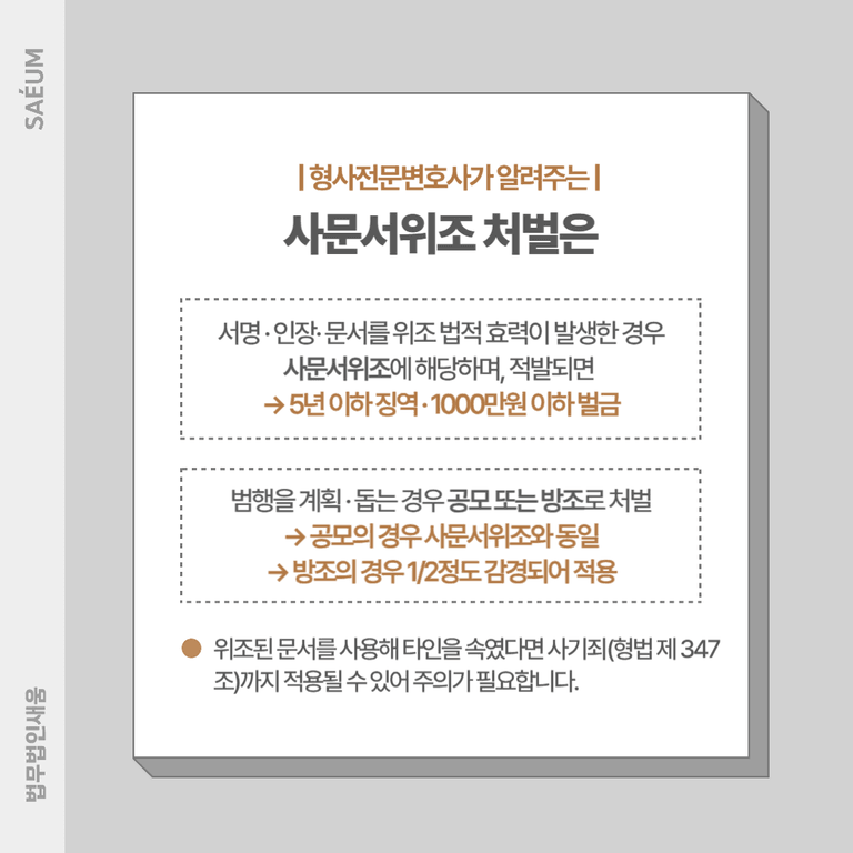특히, 위조된 문서를 사용하여 타인을 속였다면 사기죄(형법 제347조)까지 적용될 수 있어 주의해야 합니다.