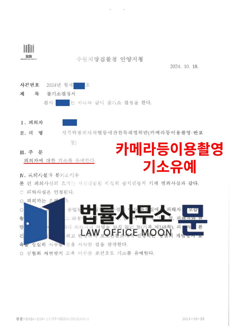 검사는 법률사무소 문의 변호인의견서를 최대한 반영하여 의뢰인에게 기소유예 결정하였습니다.