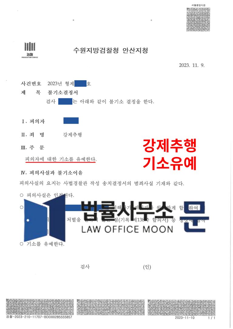 검사는 법률사무소 문의 변호인의견서를 십분 참작하고 반영하여 의뢰인에게 기소유예 결정하였습니다.