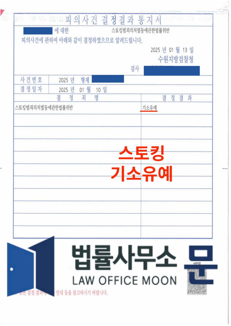 법률사무소 문은 의뢰인과의 상담을 통하여 의뢰인의 행위가 스토킹에 해당된다고 판단하였고, 이에 기소유예를 목표로 피해자와의 합의를 통한 피해자의 피해회복에 주력하는 한편, 의뢰인에게 유리한 양형자료를 최대한 수집하였으며, 수사기관에 혐의를 인정하는 등 수사에 성실히 협조하였고, 이를 반영한 변호인의견서를 수사기관에 제출하였습니다.