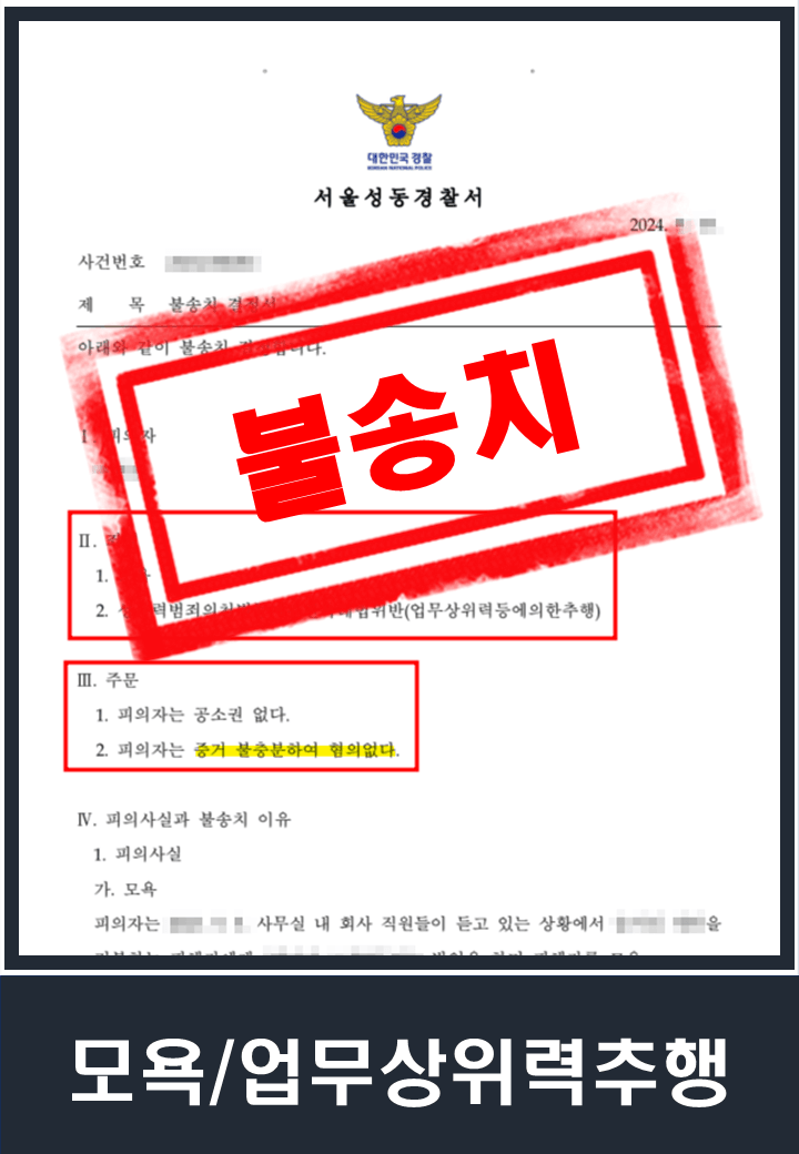 3개월간의 수사 끝에, 경찰은 A 팀장에 대한 모욕죄 고소에 대해 '공소권 없음' 처분을, 강제추행 혐의에 대해서도 '혐의 없음(증거 불충분)' 처분을 내렸고 그간 마음고생을 하던 A 팀장은 그제야 예전의 일상으로 복귀할 수 있었습니다.