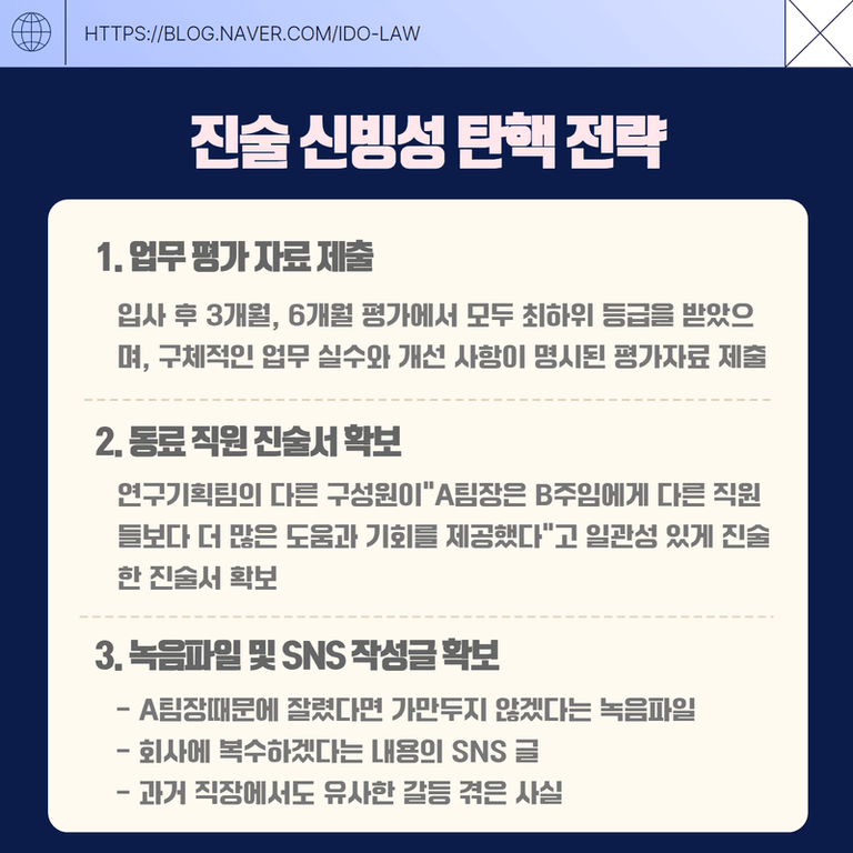 셋째, B 주임이 권고사직 통보를 받은 후 인사팀장에게 "A 팀장 때문에 잘렸다면 가만두지 않겠다"고 말한 녹음 파일을 확보했습니다. 또한 B 주임이 회사를 그만둔 후 SNS에 "회사에 복수하겠다"라는 내용의 글을 올렸다가 삭제한 정황과, 과거 이전 직장에서도 유사한 갈등을 겪었다는 사실 또한 적극적으로 확보하였습니다. 이는 B 주임의 고소가 복수심에서 비롯되었을 가능성을 시사하는 중요한 증거였습니다.