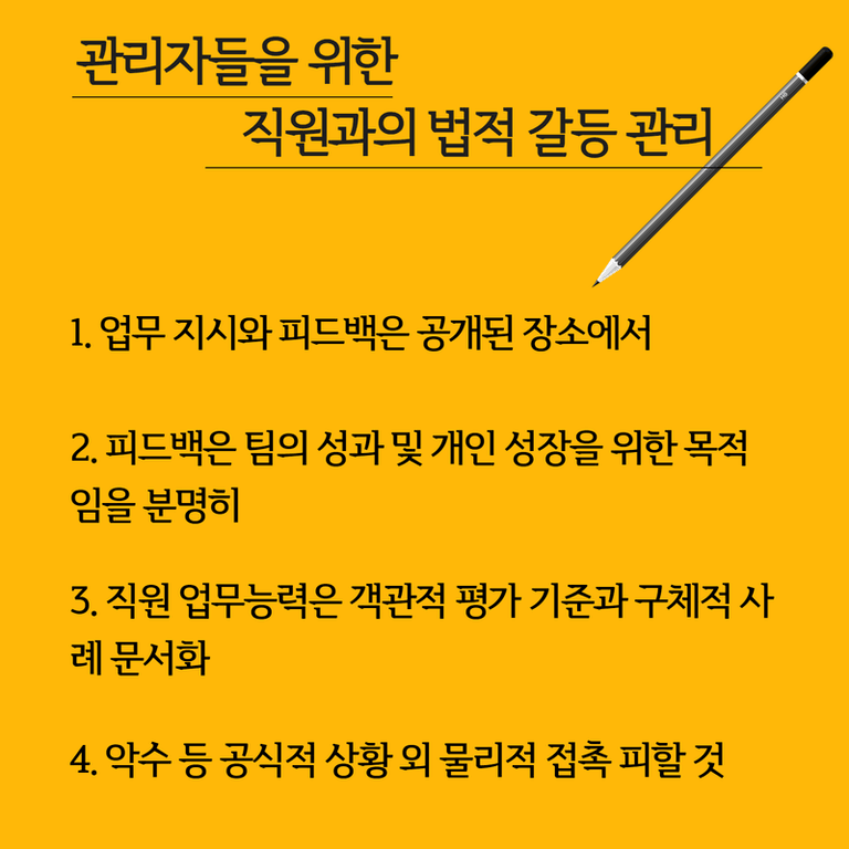 위 A 팀장의 사례는 아무리 선의를 가지고 부하직원을 지도하더라도, 구체적인 증거와 객관적인 기록 없이는 법적 위험에 노출될 수 있다는 점을 보여줍니다. 그러나 이러한 위험을 줄이기 위한 방법은 분명히 존재합니다. 업무 지시와 피드백의 객관화, 중요한 대화의 기록화, 신체적 접촉 지양, 그리고 무엇보다 직원의 성장을 진심으로 돕고자 하는 태도가 중요합니다.