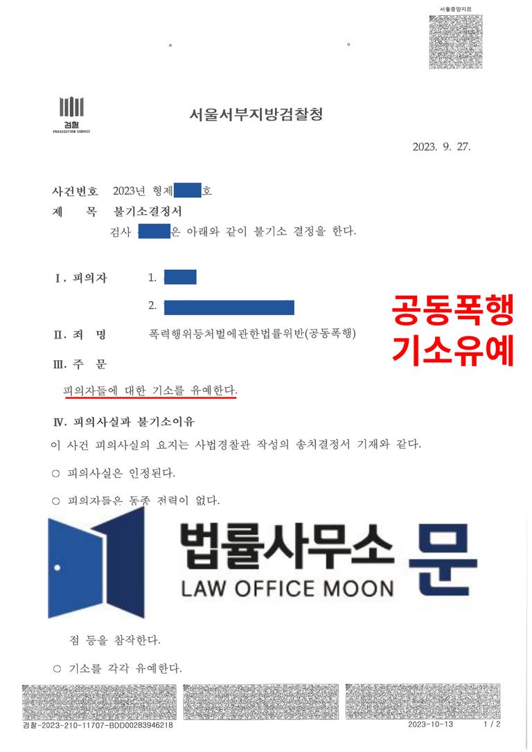 검사는 이 사건의 경위 등을 상세히 서술한 법률사무소 문의 변호인의견서를 십분 참작하여 의뢰인을 기소유예 결정하였습니다.