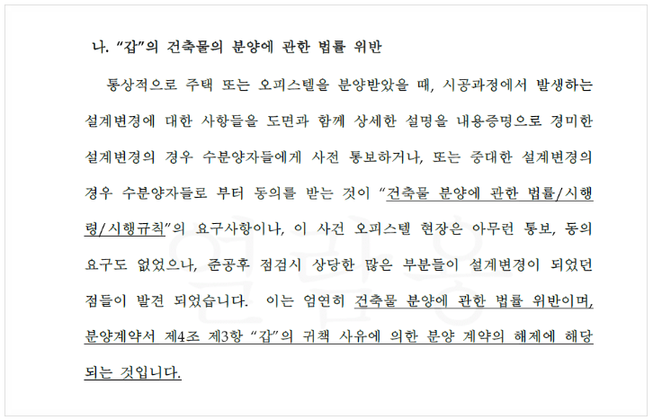 고급 마감재와 하이엔드 복합주거시설을 내세웠지만, 완성도가 매우 낮은데다 동의 없이 설계변경이 이루어진 점들이 발견되어 많은 분양자들께서 법률검토를 진행하신 바 있으며, 이에 따라 최근 최동욱 변호사를 통해 분양계약 해제를 위한 법적인 절차를 진행 중이신 의뢰인의 사례가 있어 이에 대해 설명해 드리고자 합니다.