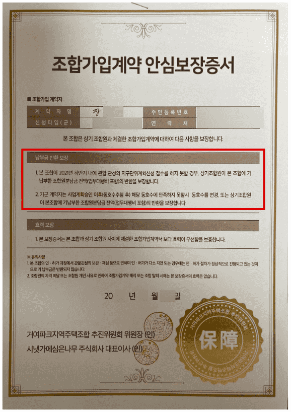 의뢰인(장00 님)께서는 2020년에 거여파크 지역주택조합에 가입하신 조합원이십니다. 해당 조합은 계약 당시 "관할 관청의 지구단위계획신청 접수를 하지 못할 경우, 혹은 사업계획승인 이후 해당 동호수에 만족하지 못할시 기 납부한 조합원 분담금 전액의 반환을 보장합니다"라고 기재된 <조합가입계약 안심보장증서>를 계약자들에게 교부하였습니다.