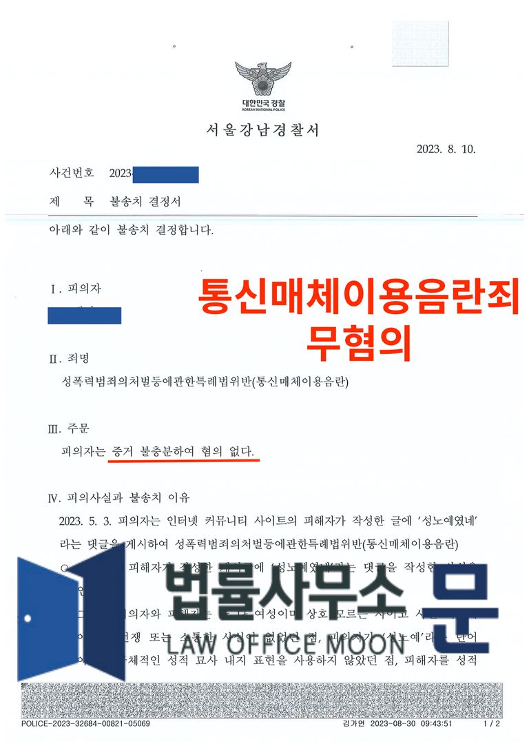 법률사무소 문은 통매음에 관련한 여러 판례를 통하여 의뢰인이 댓글로 단 내용은 통매음에 해당하지 않으므로 무혐의 처분을 하여달라는 내용의 변호인의견서를 작성하여 수사기관에 제출하였고, 수사관과의 꾸준한 소통으로 해당 내용에 관하여 계속 주장하였습니다.