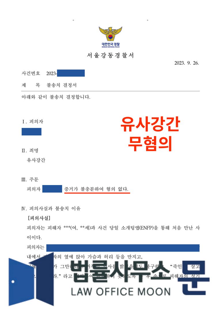 법률사무소 문은 의뢰인과의 상담을 통하여 의뢰인이 유사강간에 해당하는 행위를 하였는지 여부, 하였다면 그러한 행위를 하게 된 경위 등을 신속하게 파악하였습니다. 의뢰인이 위와 같은 행위를 한 것은 사실이나 사건 당시 서로 취할 정도는 아니었다는 점, 피해자가 의뢰인에게 먼저 만나서 술을 마시자고 하였던 점 등 의뢰인에게 유리한 사유가 많다는 것도 파악하였고, 피해자가 취한 상태가 아니었다는 점을 밝히기 위해 노래방의 CCTV를 확보하는 등 의뢰인의 무혐의를 입증하기 위해 최선을 다하였습니다.