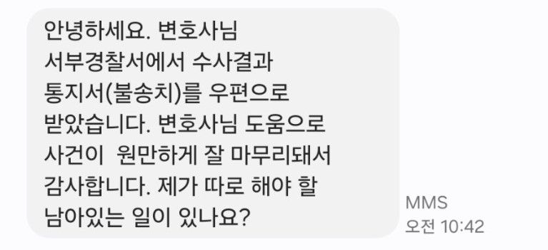 이후 의뢰인의 동의 하에 거짓말탐지기 조사까지 예정되어 있었으나 위와 같은 정상들을 참작하여 담당 경찰서에서는 의뢰인에 대해 '불송치결정(혐의없음)' 을 내려 주었고, 그동안 심히 마음고생을 했던 의뢰인께서는 마침내 누명을 벗고 형사처벌의 위험, 압박에서 벗어날 수 있었습니다.