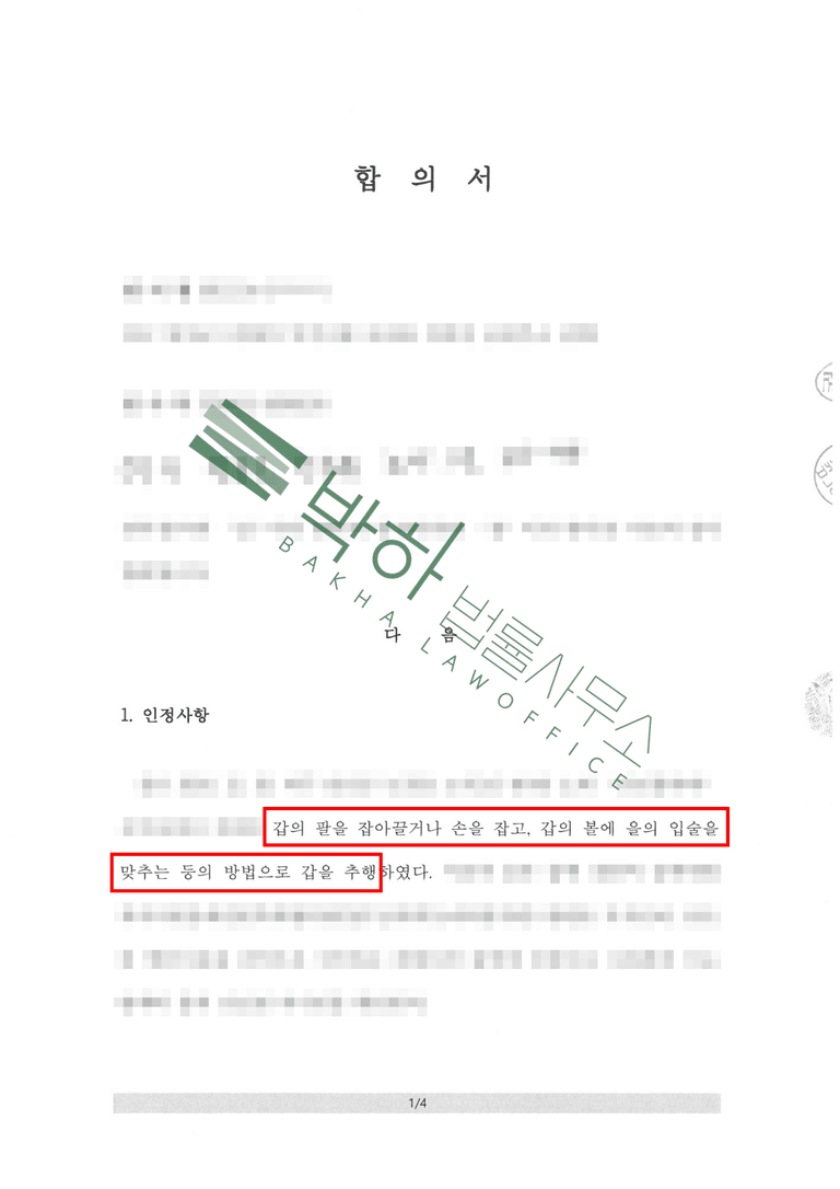 피해자는 사건이 회사에 알려지는 것을 원치 않았기에 형사고소나 회사 내부신고를 주저하면서도 회사에서 가해자를 마주치는 것이 두렵고 불편하여, 윤소영 변호사와의 상담 후 고소 전 합의를 진행하기로 결심하고 박하 법률사무소를 찾아주셨습니다.