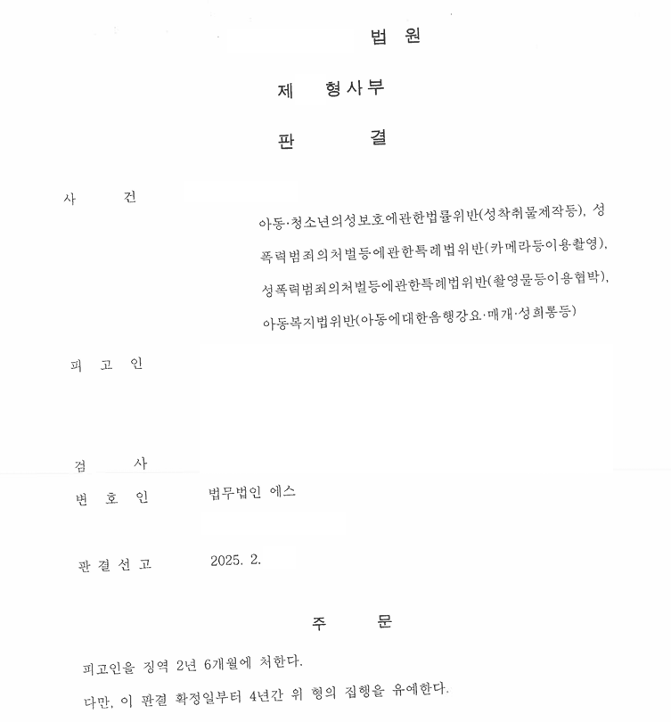 5. A씨는 아청제작등 사건에서 저희의 조력을 받음으로써 1심 단계에서 집행유예 선고를 받으셨습니다.