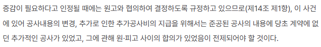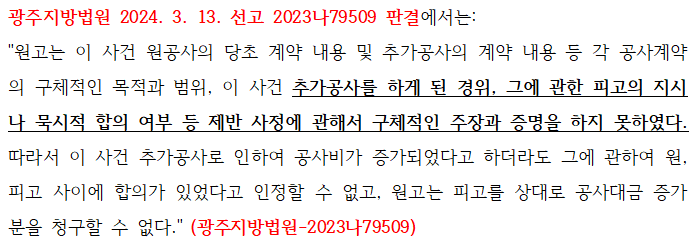 바로 공사대금을 청구하는 업체에서 입증책임을 부담합니다. 때문에 업체는 추가 공사계약이 있었다는 사실 (합의) 및 계약에 따라 실제 추가 공사가 진행된 사실을 모두 입증해야 합니다. 만일 합의가 없었다면, 설령 추가공사로 인하여 공사비가 증가되었다고 하더라도 추가 공사대금 청구가 어렵습니다.