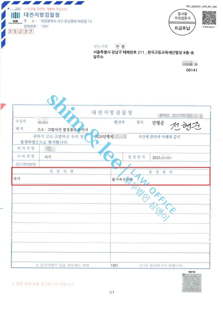 - 긴 수사 과정을 거친 끝에 가해자의 사기 혐의가 인정되어 사건은 불구속 구공판으로 기소되었습니다.