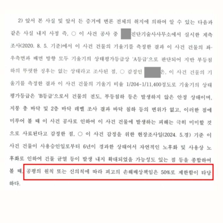 마지막으로 청구를 방어하는 입장에서는 인접 건물의 노후화로 인한 건물균열 발생 내지 확대 가능성 등을 적절하게 다투어 ‘공평 또는 신의칙에 따라 감정인이 산정한 손해액에 대한 감액을 최대한 받아내야 합니다.