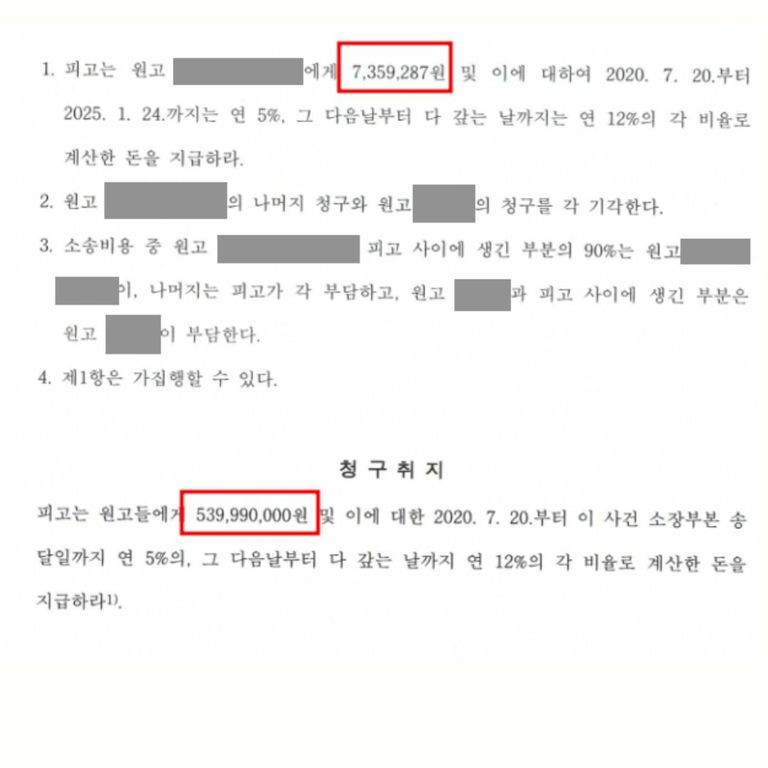 결국, 원고가 청구한 5억 4천만 원의 손해배상청구에 대하여 위와 같이 치열히 다툰 끝에 최종 감정액의 50%를 감액한 7,359,287원만 배상하라는 판결을 받게 되었습니다.^^