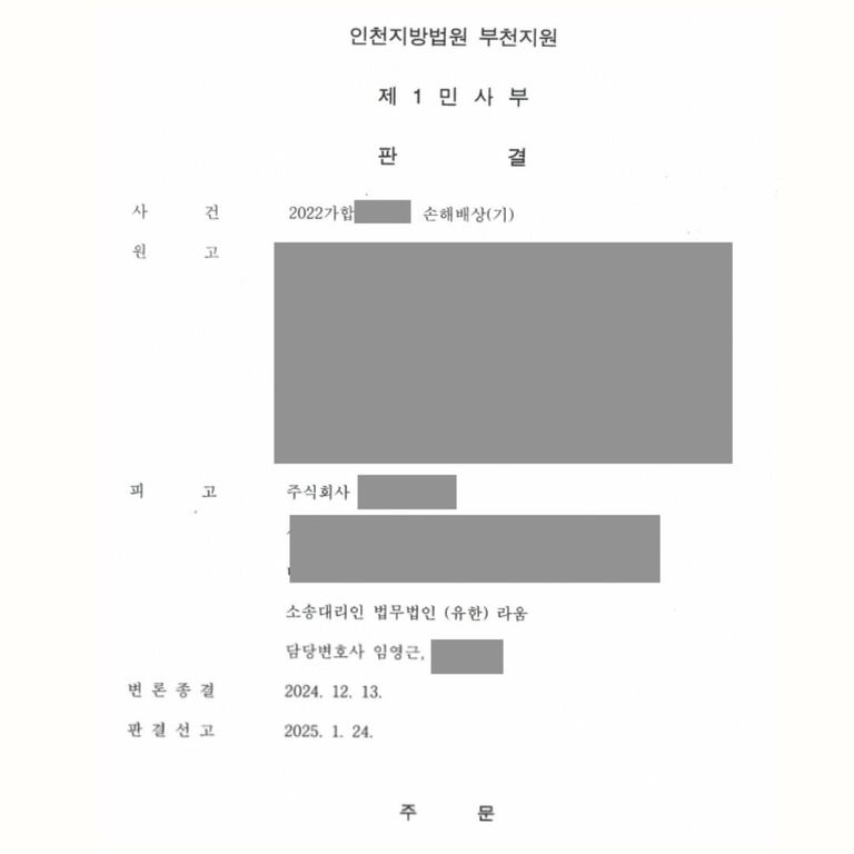 이번 사건도 공사 진행 과정부터 개입해서 확정될 때까지 많은 시간이 걸렸는데요. 문제 발생 시 상당한 비용을 지불하시고 전문진단업체로터 조사를 받으시는 등 저의 방향대로 잘 따라와 주셔서 너무 감사했고, 좋은 결과로 보답을 해드려서 참 보람된 재판이었습니다.
